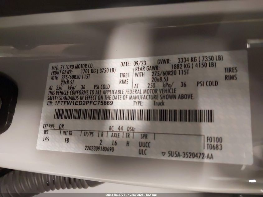 2023 FORD F-150 2023 року Гибрид, 3.5, Полный привод, vin - 1FTFW1ED2PFC75869 из США