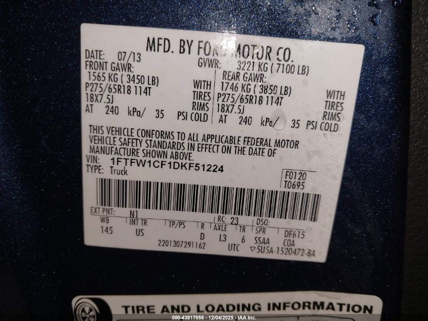 Цвет СинийЦилиндры 8VIN 1FTFW1CF1DKF51224Состояние Заводится и едет (проверено)Повреждения Передняя или задняя AutoRIA