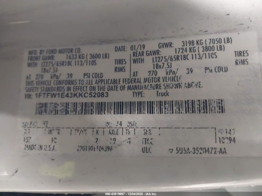 2019 FORD F-150 2019 року Бензин, 3.5, Полный привод, vin - 1FTFW1E43KKC52083 из США