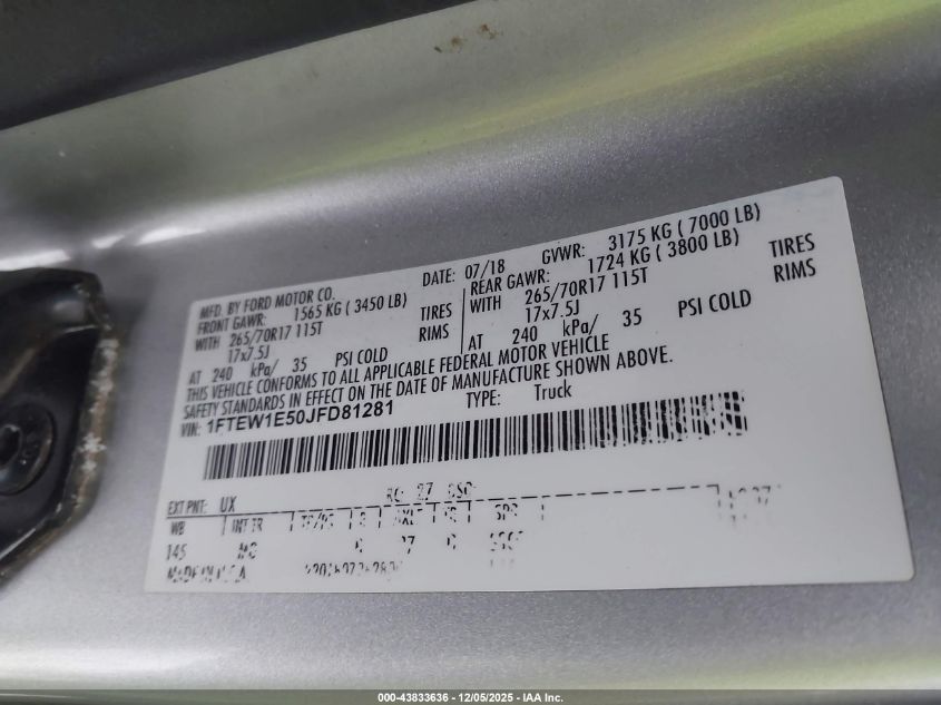 2018 FORD F-150 2018 року Бензин, 5.0, Полный привод, vin - 1FTEW1E50JFD81281 из США