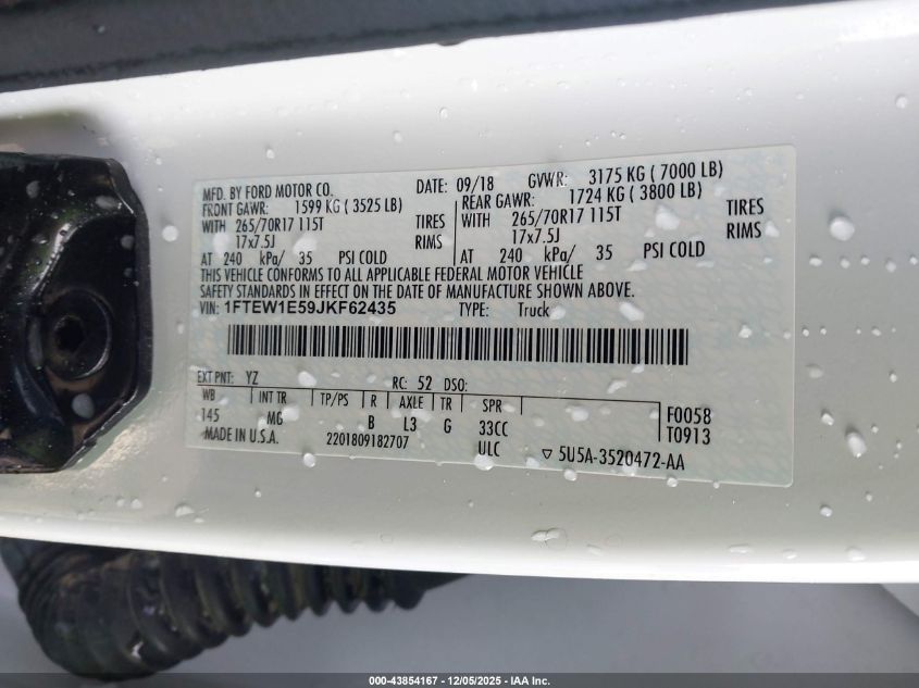Цвет БелыйЦилиндры 8Привод Полный приводVIN 1FTEW1E59JKF62435Состояние Заводится и едет (проверено)Повреждения Передняя или задняя AutoRIA