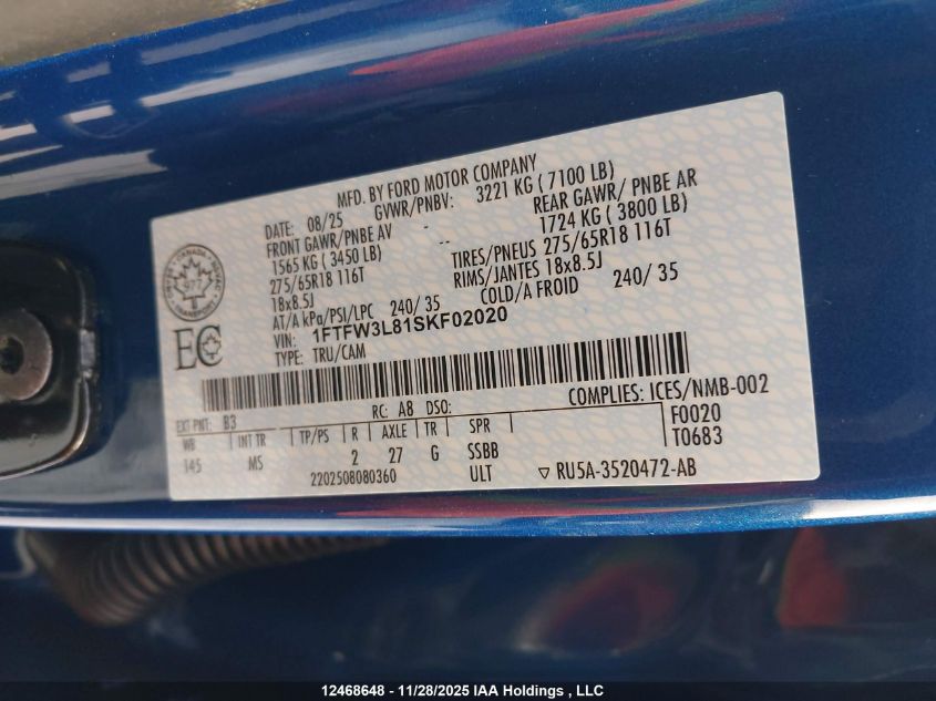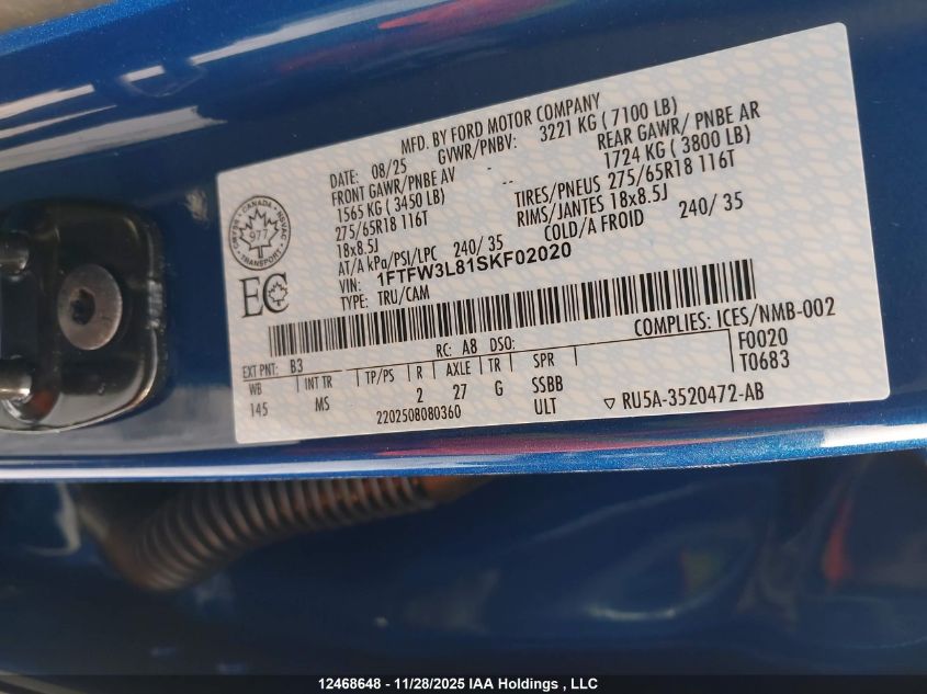 2025 FORD F-150 2025 року Бензин, , Полный привод, vin - 1FTFW3L81SKF02020 из США