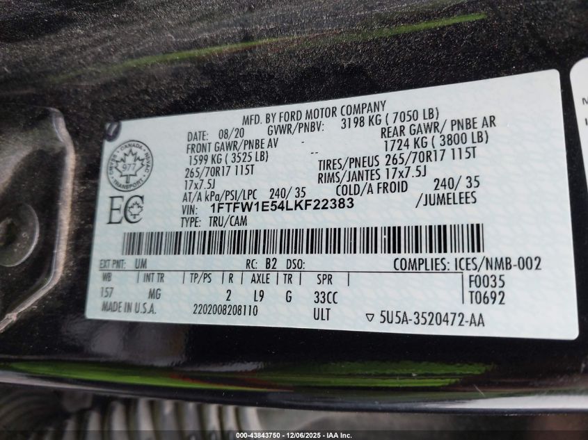 2020 FORD F-150 2020 року Бензин, 5.0, Полный привод, vin - 1FTFW1E54LKF22383 из США