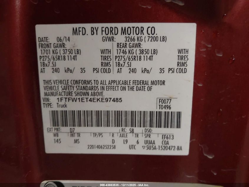 2014 FORD F-150 2014 року Бензин, 3.5, Полный привод, vin - 1FTFW1ET4EKE97485 из США