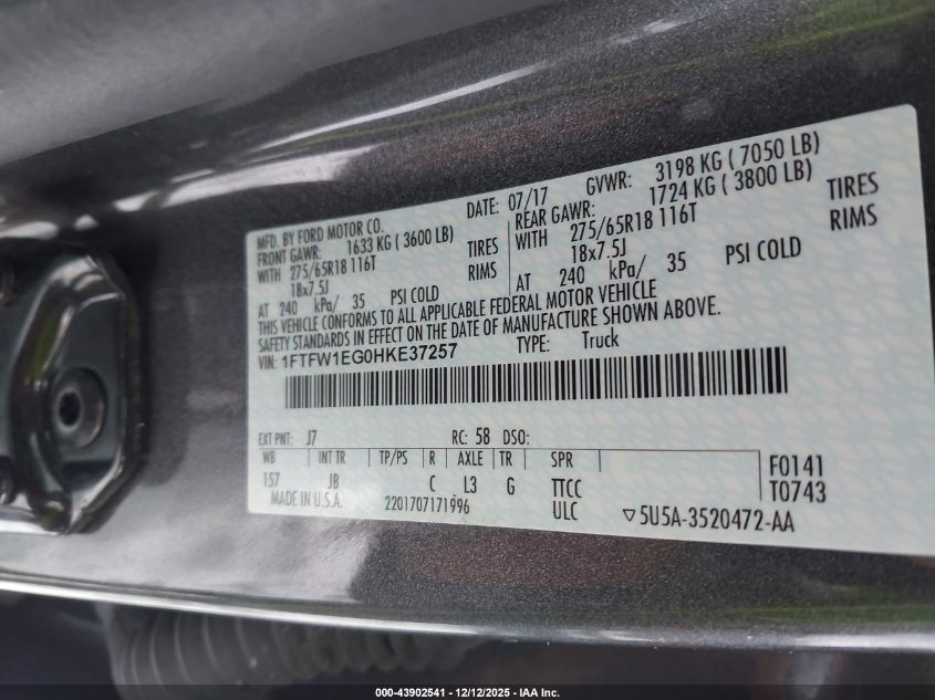 2017 FORD F-150 2017 року Бензин, 3.5, Полный привод, vin - 1FTFW1EG0HKE37257 из США