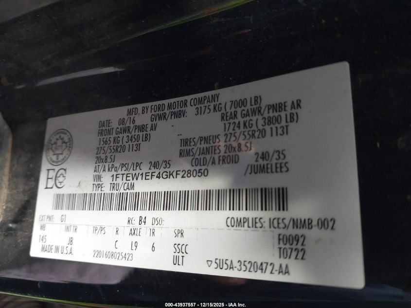 2016 FORD F-150 2016 року Бензин, 5.0, Полный привод, vin - 1FTEW1EF4GKF28050 из США