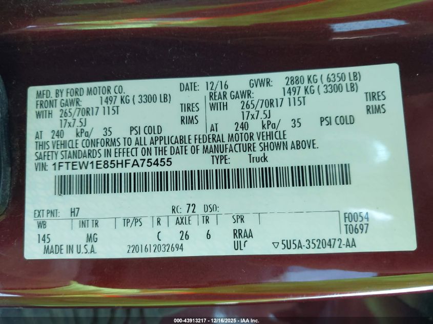 2017 FORD F-150 2017 року Бензин, 3.5, Полный привод, vin - 1FTEW1E85HFA75455 из США