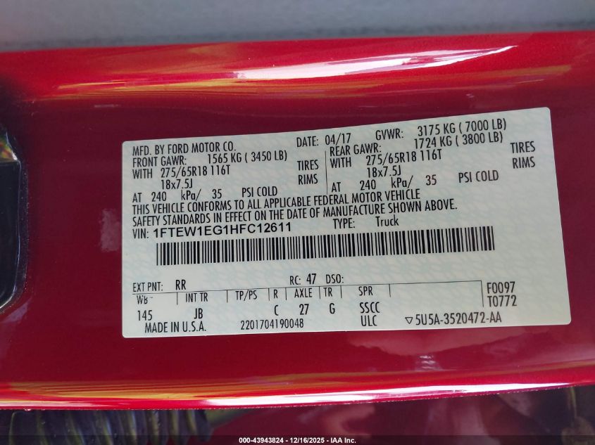 2017 FORD F-150 2017 року Бензин, 3.5, Полный привод, vin - 1FTEW1EG1HFC12611 из США
