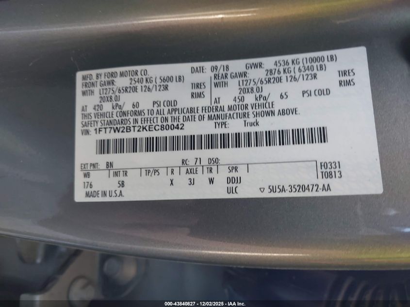 Цвет СерыйЦилиндры 8Привод Полный приводVIN 1FT7W2BT2KEC80042Состояние СтационарноПовреждения Опрокидывание