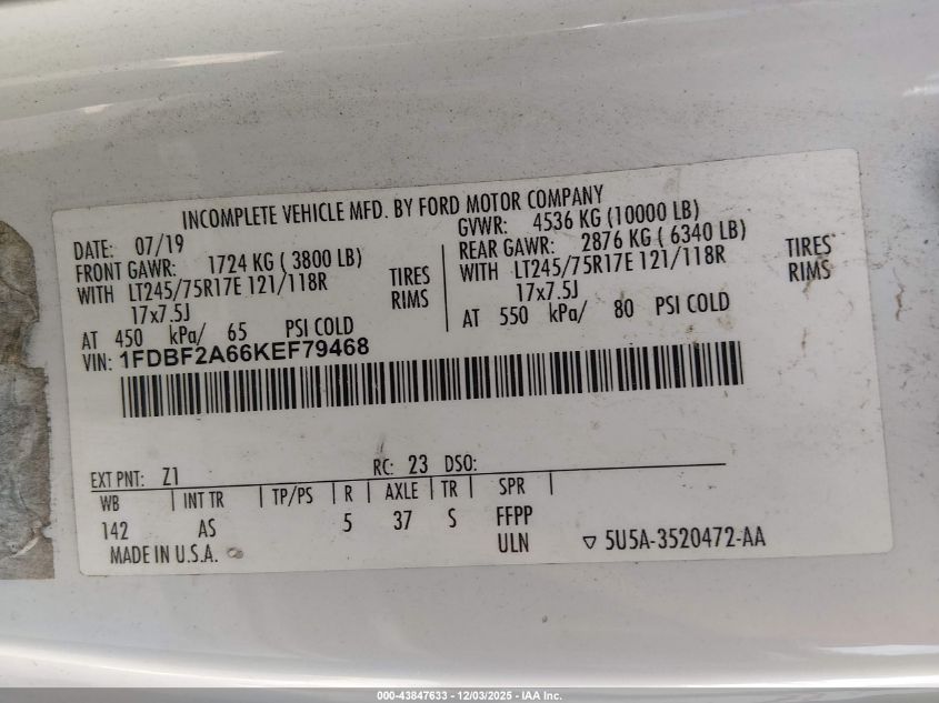 Цвет БелыйЦилиндры 8VIN 1FDBF2A66KEF79468Состояние СтационарноПовреждения Задняя