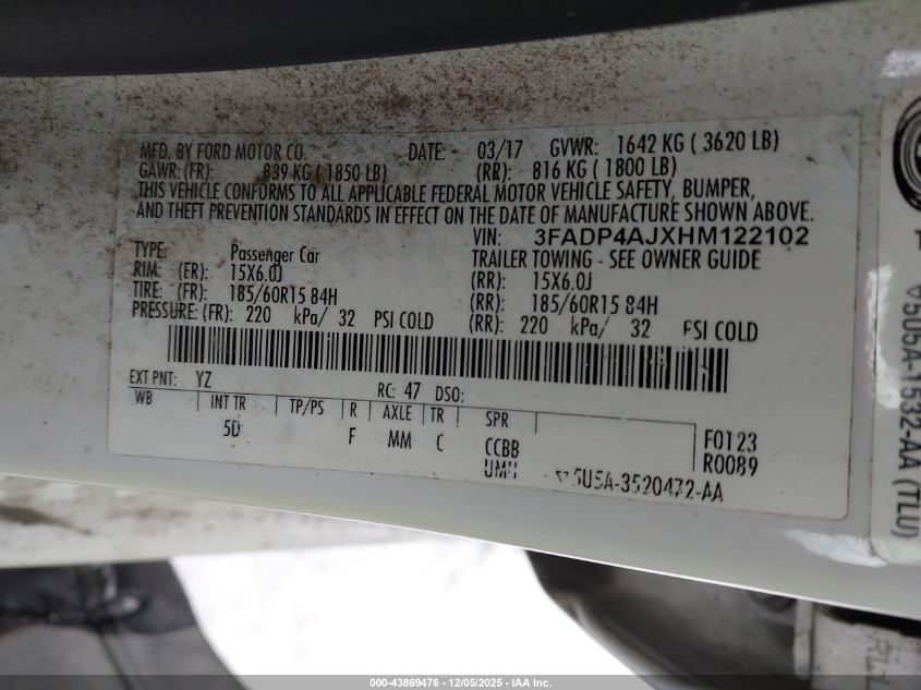 Цвет БелыйЦилиндры 4Привод Передний приводVIN 3FADP4AJXHM122102Состояние Заводится и едет (проверено)Повреждения Передняя или задняя AutoRIA