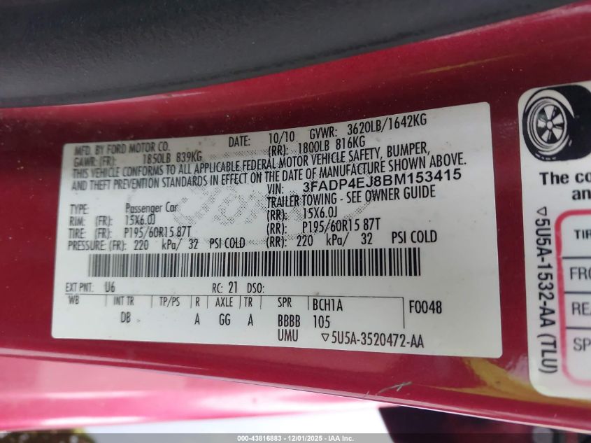 Цвет КрасныйЦилиндры 4Привод Передний приводVIN 3FADP4EJ8BM153415Состояние Заводится и едет (проверено)Повреждения Передняя левая AutoRIA