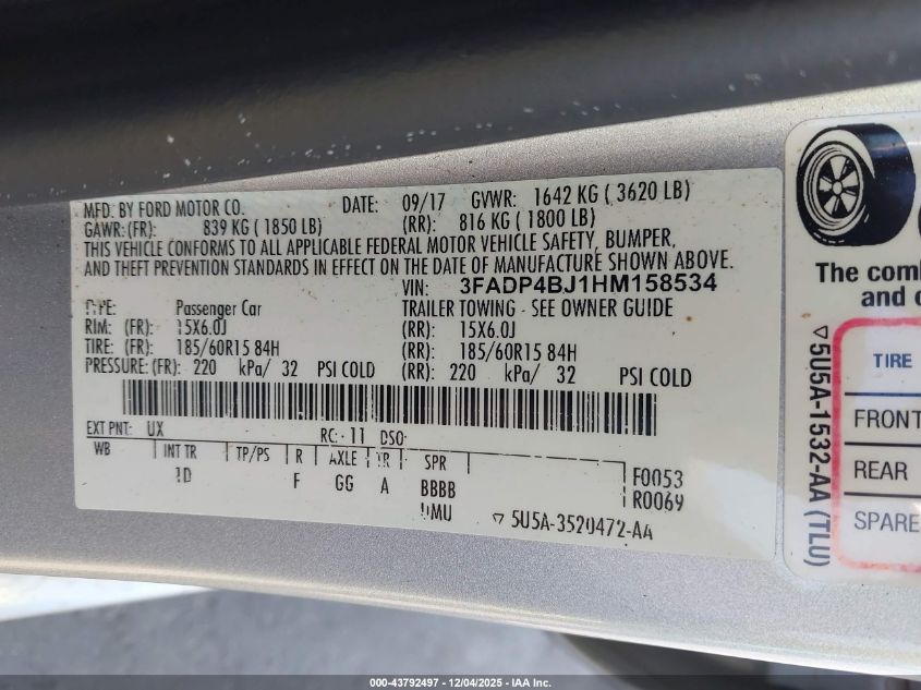 Цвет СеребряныйЦилиндры 4Привод Передний приводVIN 3FADP4BJ1HM158534Состояние СтационарноПовреждения Передняя или задняя AutoRIA