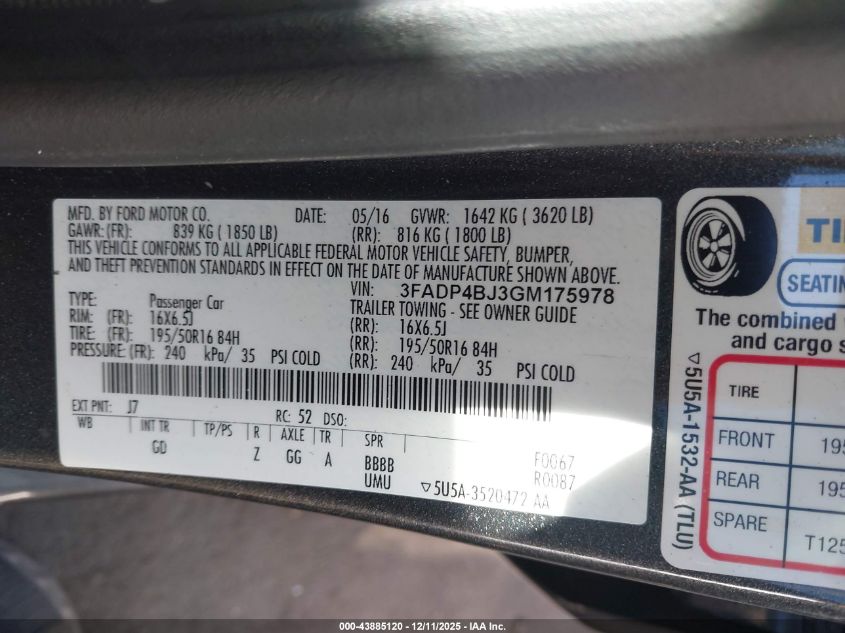 Цвет СерыйЦилиндры 4Привод Передний приводVIN 3FADP4BJ3GM175978Состояние Заводится и едет (проверено)Повреждения Передняя или задняя AutoRIA