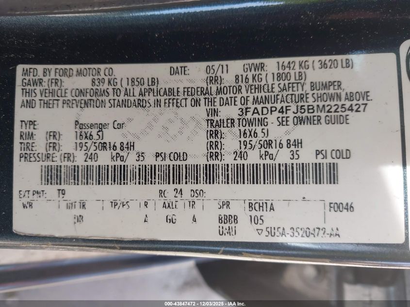 2011 FORD FIESTA 2011 року Бензин, 1.6, Передний привод, vin - 3FADP4FJ5BM225427 из США