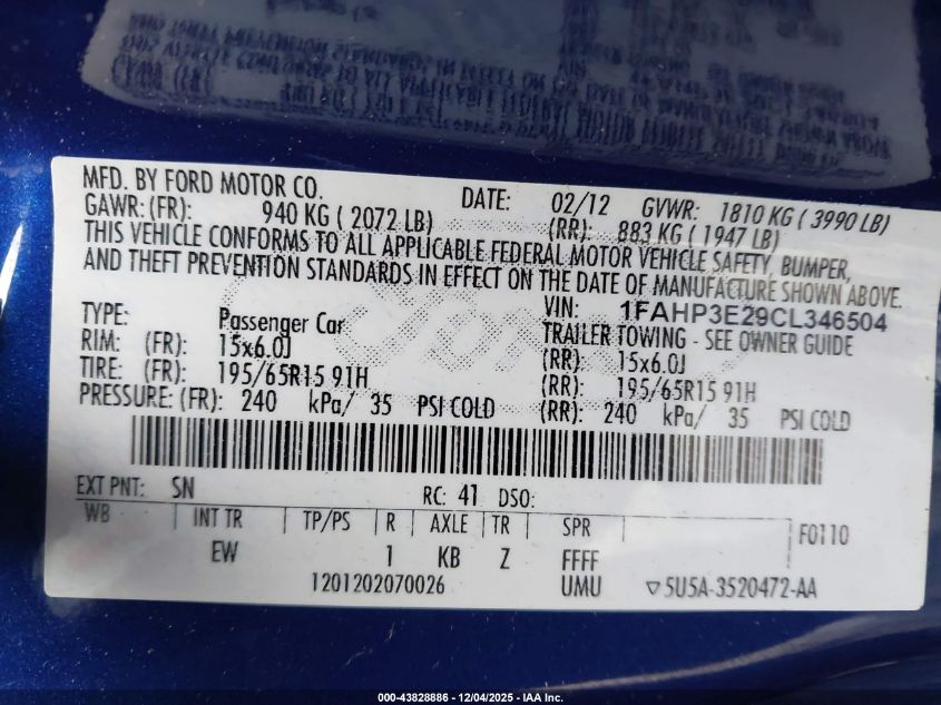 Цвет СинийЦилиндры 4Привод Передний приводVIN 1FAHP3E29CL346504Состояние СтационарноПовреждения Передняя или задняя AutoRIA