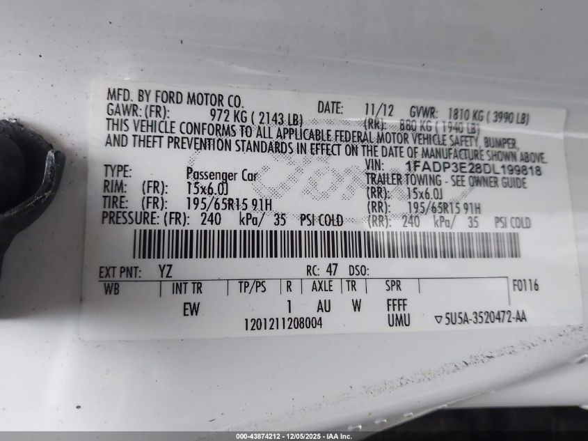 Цвет БелыйЦилиндры 4Привод Передний приводVIN 1FADP3E28DL199818Состояние Заводится и едет (проверено)Повреждения Передняя или задняя AutoRIA