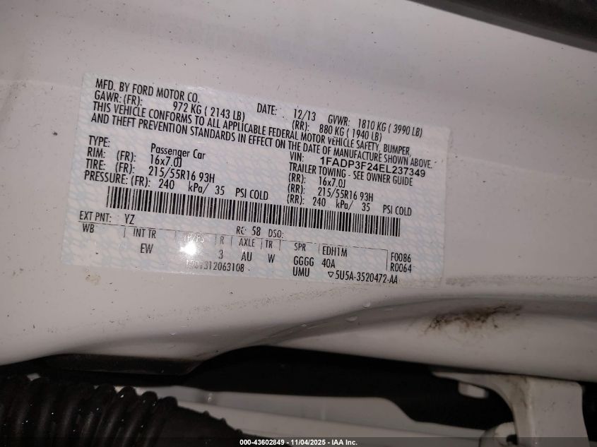 Цвет БелыйЦилиндры 4Привод Передний приводVIN 1FADP3F24EL237349Состояние Заводится и едет (проверено)Повреждения Левая сторонаДата аукциона 2025-12-09 AutoRIA