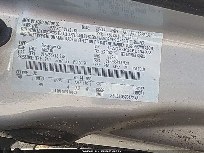 Цвет СеребряныйЦилиндры 4Привод Передний приводVIN 1FADP3K24EL404878Состояние Заводится и едет (проверено)Повреждения Обычный износДата аукциона 2025-12-09 AutoRIA