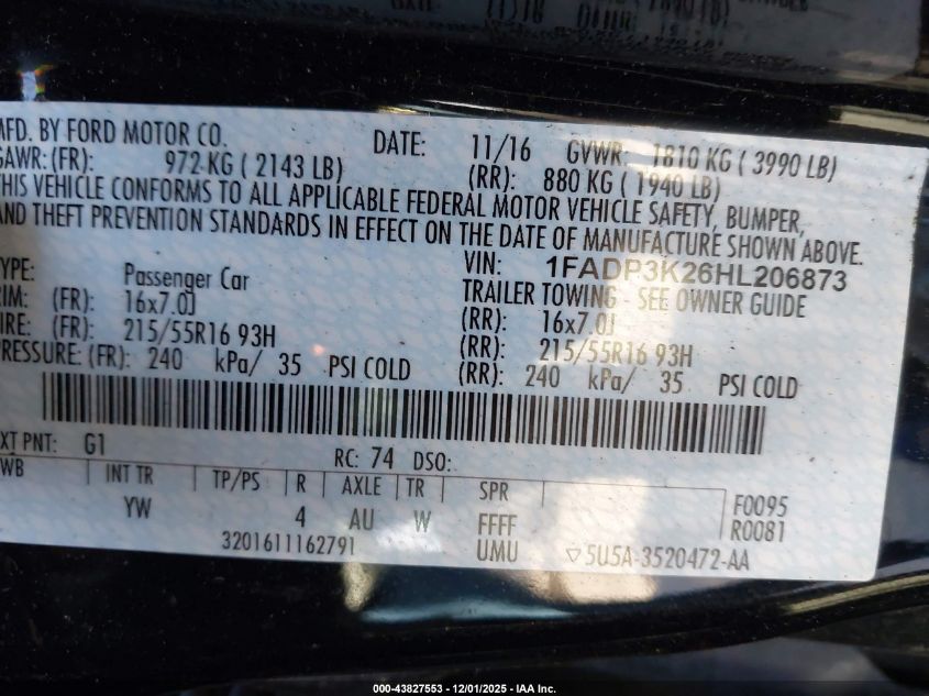 2017 FORD FOCUS 2017 року Бензин, 2.0, Передний привод, vin - 1FADP3K26HL206873 из США