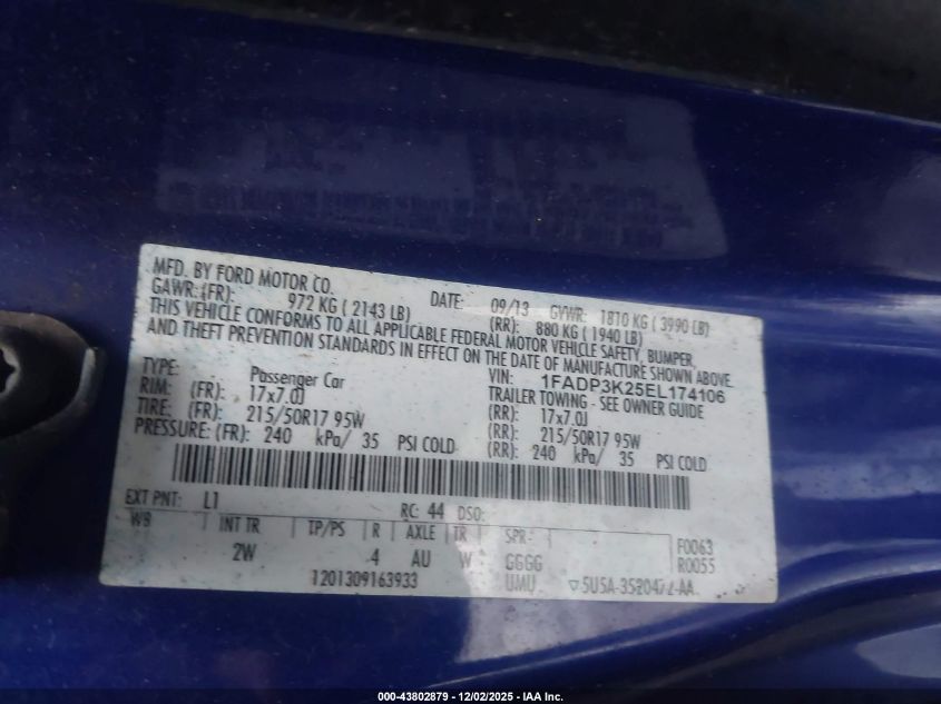 Цвет СинийЦилиндры 4Привод Передний приводVIN 1FADP3K25EL174106Состояние СтационарноПовреждения Передняя или задняя AutoRIA