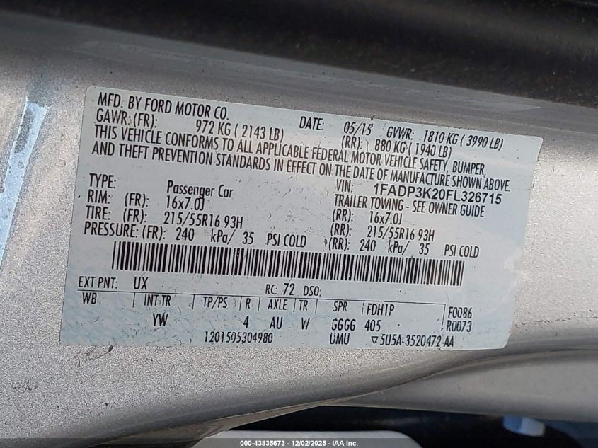 Цвет СеребряныйЦилиндры 4Привод Передний приводVIN 1FADP3K20FL326715Состояние Заводится и едет (проверено)Повреждения Передняя правая AutoRIA