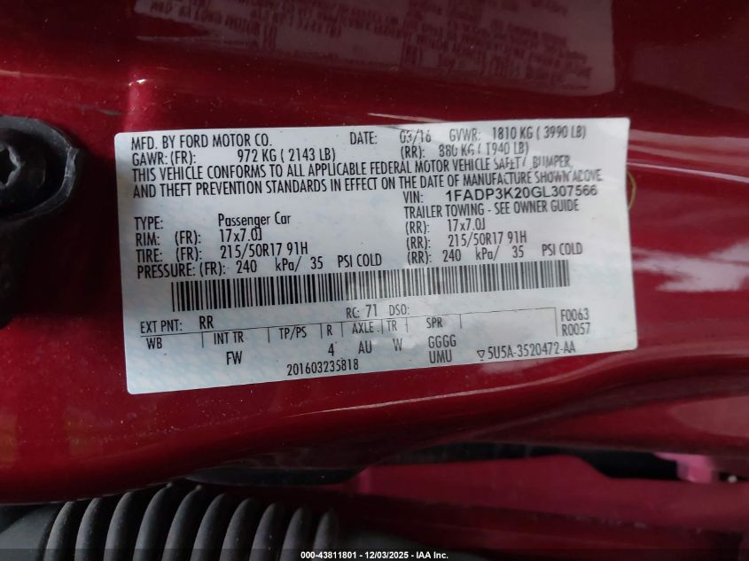2016 FORD FOCUS 2016 року Бензин, 2.0, Передний привод, vin - 1FADP3K20GL307566 из США