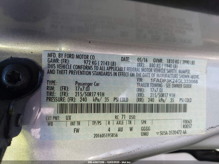 2016 FORD FOCUS 2016 року Бензин, 2.0, Передний привод, vin - 1FADP3K24GL333068 из США