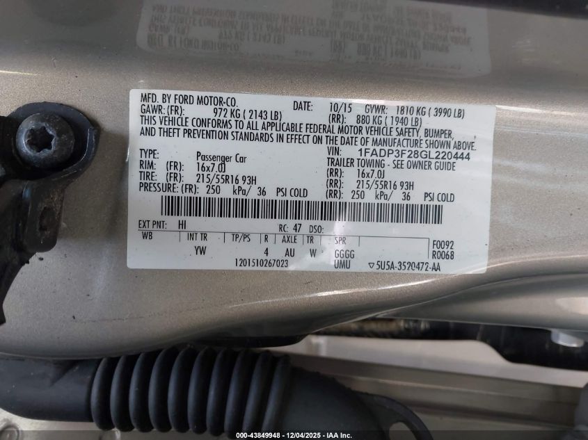2016 FORD FOCUS 2016 року Бензин, 2.0, Передний привод, vin - 1FADP3F28GL220444 из США