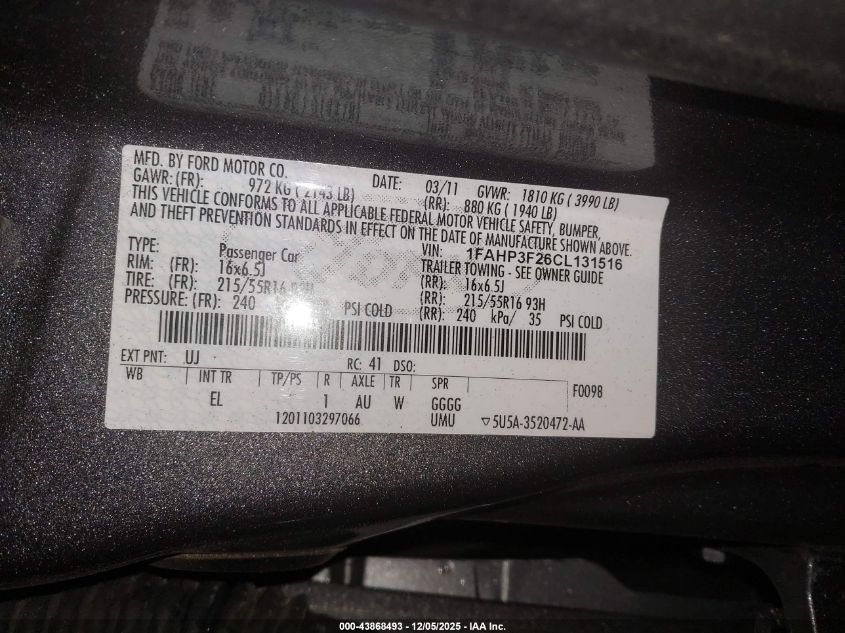Цвет СерыйЦилиндры 4Привод Передний приводVIN 1FAHP3F26CL131516Состояние СтационарноПовреждения Правая сторона AutoRIA