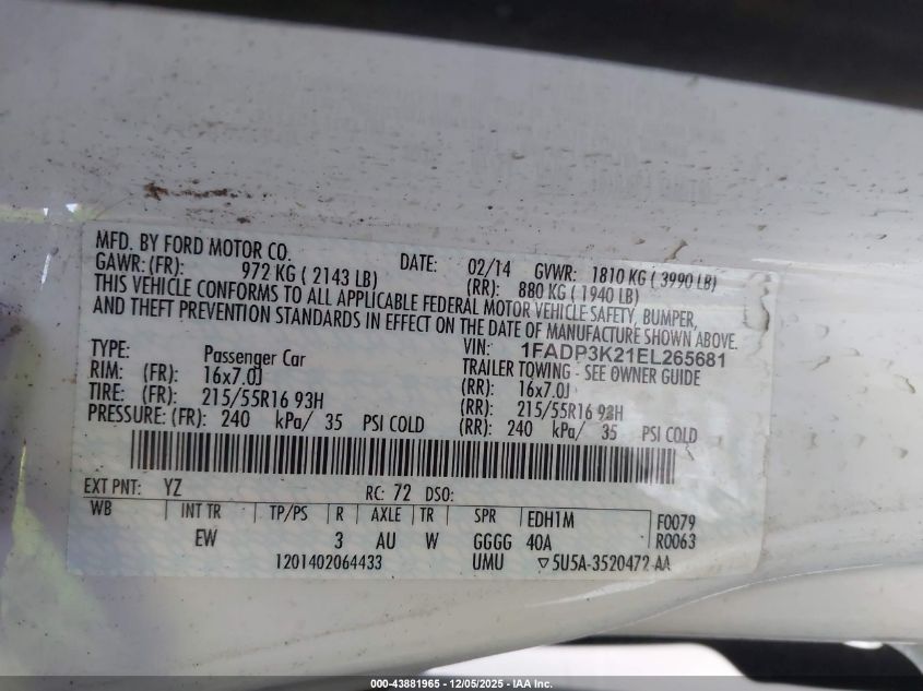 Цвет БелыйЦилиндры 4Привод Передний приводVIN 1FADP3K21EL265681Состояние СтационарноПовреждения Задняя AutoRIA