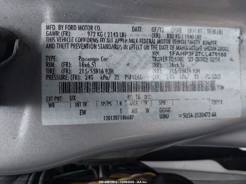 Цвет СеребряныйЦилиндры 4Привод Передний приводVIN 1FAHP3F27CL478188Состояние Заводится и едет (проверено)Повреждения Передняя левая AutoRIA