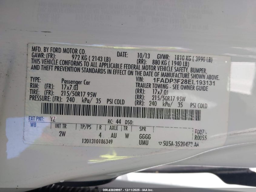 Цвет БелыйЦилиндры 4Привод Передний приводVIN 1FADP3F28EL193131Состояние Заводится и едет (проверено)Повреждения Правая сторона AutoRIA