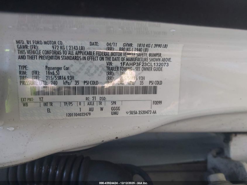 Цвет БелыйЦилиндры 4Привод Передний приводVIN 1FAHP3F23CL132073Состояние Заводится и едет (проверено)Повреждения Левая сторона AutoRIA