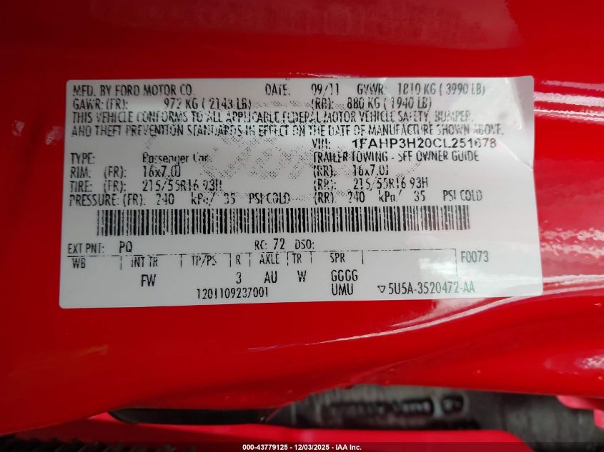 Цвет КрасныйЦилиндры 4Привод Передний приводVIN 1FAHP3H20CL251678Состояние СтационарноПовреждения Передняя или задняя AutoRIA
