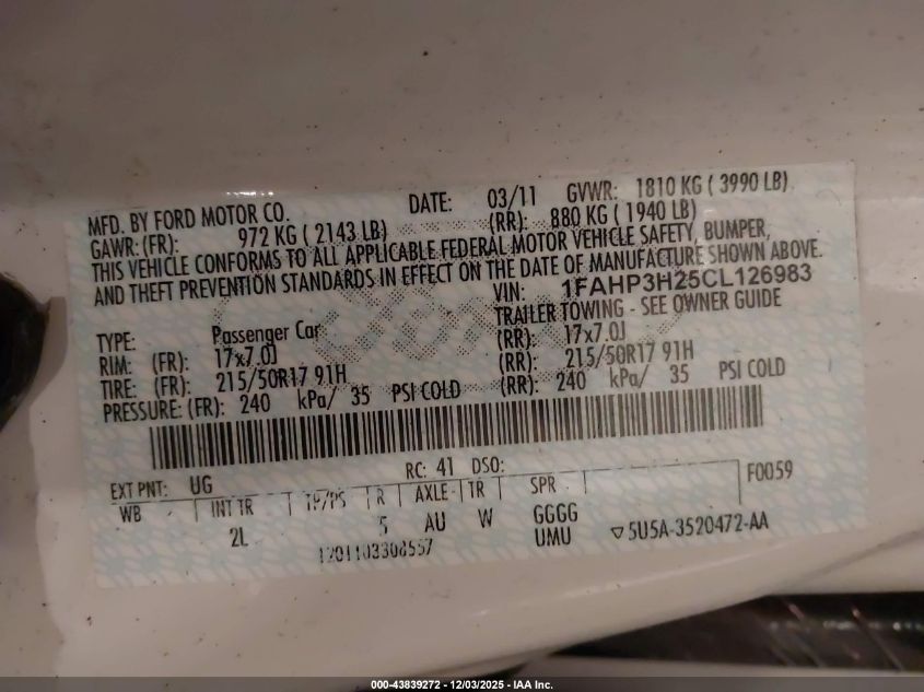 Цвет БелыйЦилиндры 4Привод Передний приводVIN 1FAHP3H25CL126983Состояние ЗаводитсяПовреждения Передняя левая AutoRIA