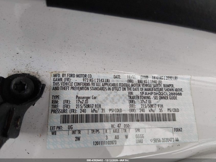 2012 FORD FOCUS 2012 року Бензин, 2.0, Передний привод, vin - 1FAHP3H22CL288988 из США
