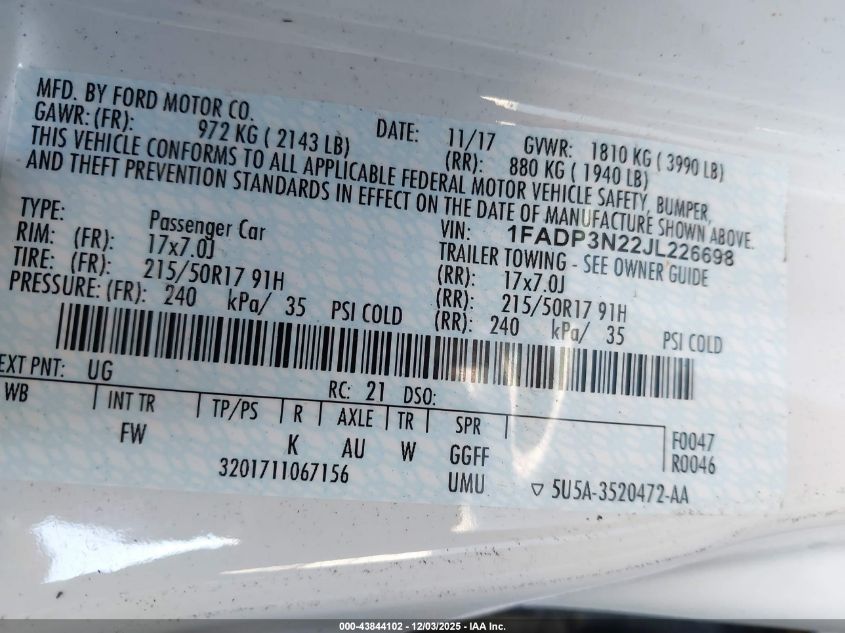 2018 FORD FOCUS 2018 року Бензин, 2.0, Передний привод, vin - 1FADP3N22JL226698 из США