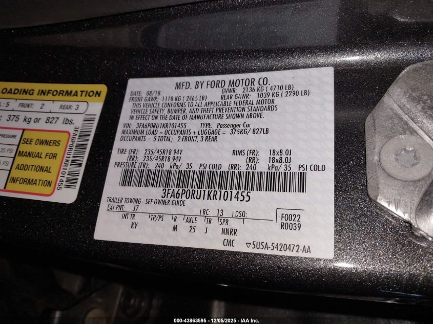 2019 FORD FUSION HYBRID 2019 року Гибрид, 2.0, Передний привод, vin - 3FA6P0RU1KR101455 из США