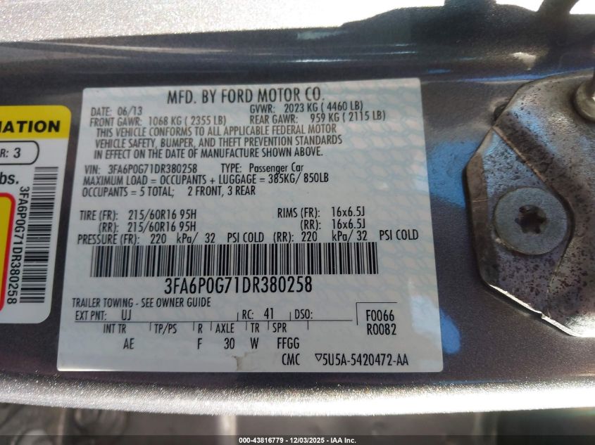 2013 FORD FUSION 2013 року Бензин, 2.5, Передний привод, vin - 3FA6P0G71DR380258 из США