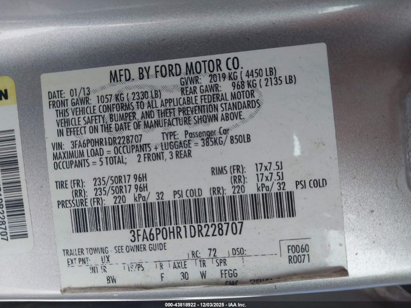 2013 FORD FUSION 2013 року Бензин, 1.6, Передний привод, vin - 3FA6P0HR1DR228707 из США
