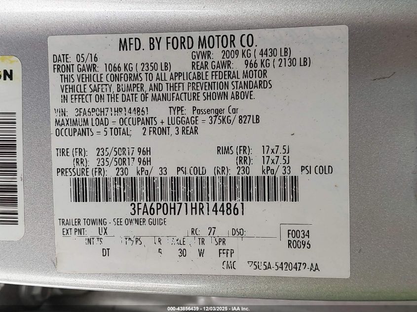 2017 FORD FUSION 2017 року Бензин, 2.5, Передний привод, vin - 3FA6P0H71HR144861 из США