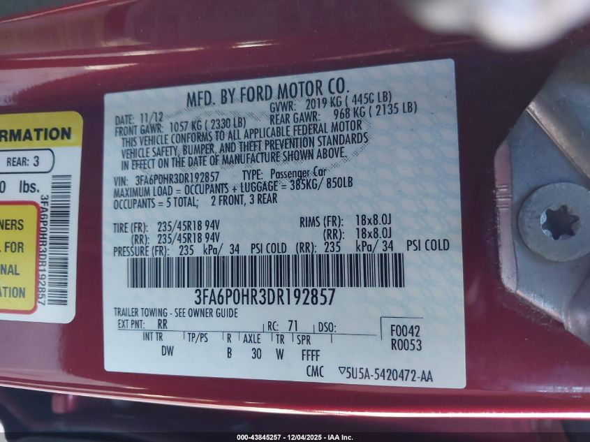 2013 FORD FUSION 2013 року Бензин, 1.6, Передний привод, vin - 3FA6P0HR3DR192857 из США