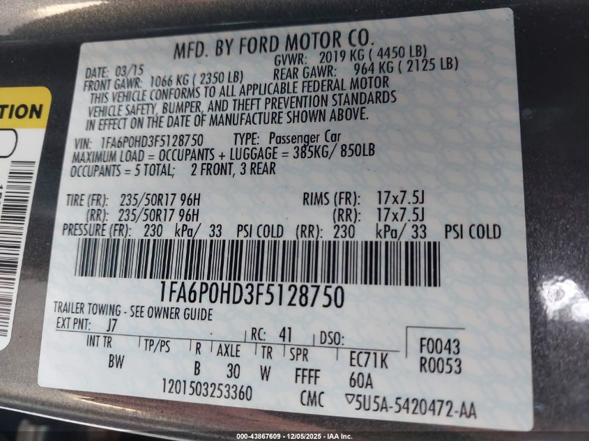 Цвет СерыйЦилиндры 4Привод Передний приводVIN 1FA6P0HD3F5128750Состояние Заводится и едет (проверено)Повреждения Задняя AutoRIA