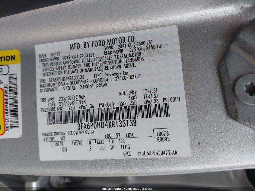 Цвет СерыйЦилиндры 4Привод Передний приводVIN 3FA6P0HD4KR133138Состояние СтационарноПовреждения Био/Химические AutoRIA