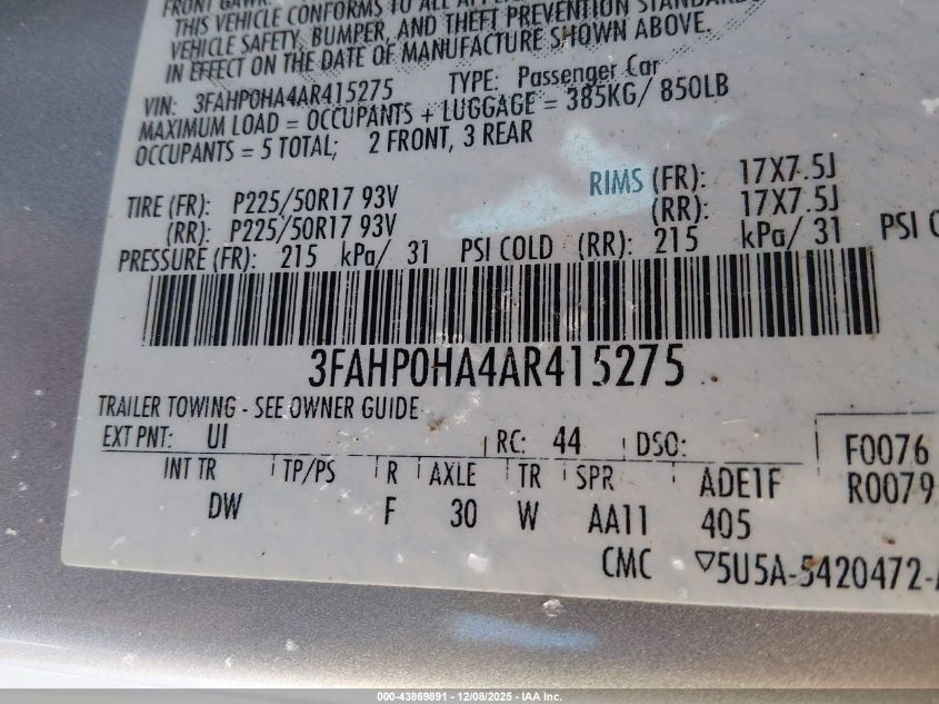 Цвет СеребряныйЦилиндры 4Привод Передний приводVIN 3FAHP0HA4AR415275Состояние Заводится и едет (проверено)Повреждения Передняя правая AutoRIA