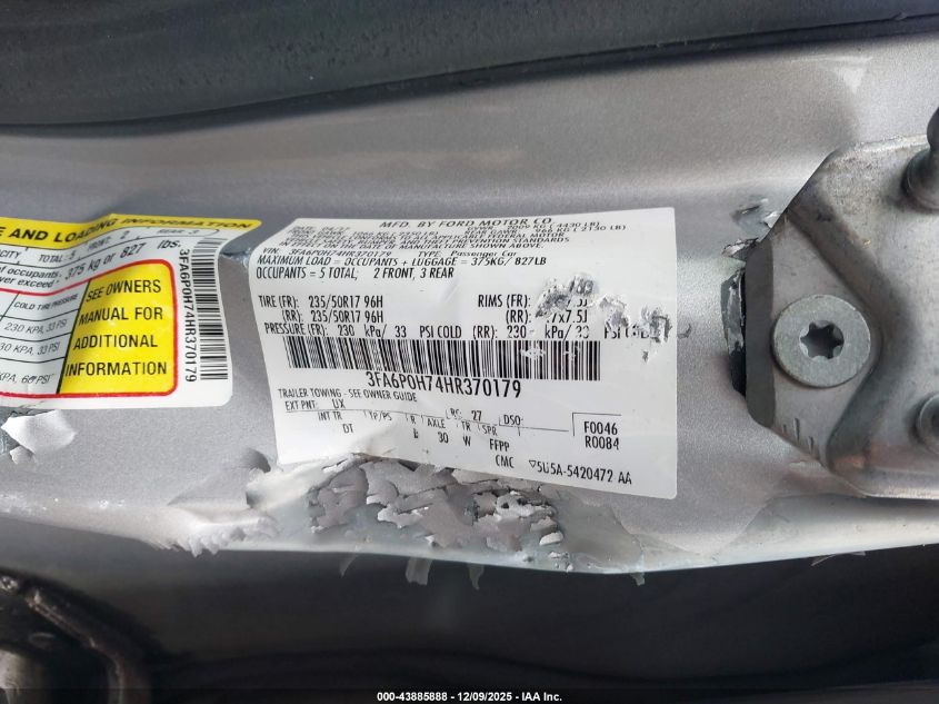 Цвет СеребряныйЦилиндры 4Привод Передний приводVIN 3FA6P0H74HR370179Состояние СтационарноПовреждения Передняя и задняя AutoRIA