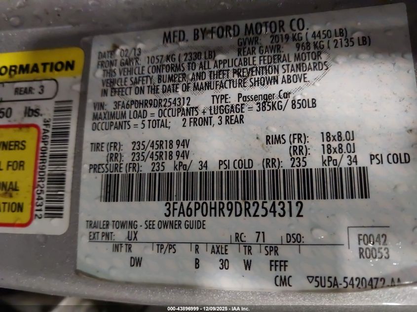 2013 FORD FUSION 2013 року Бензин, 1.6, Передний привод, vin - 3FA6P0HR9DR254312 из США
