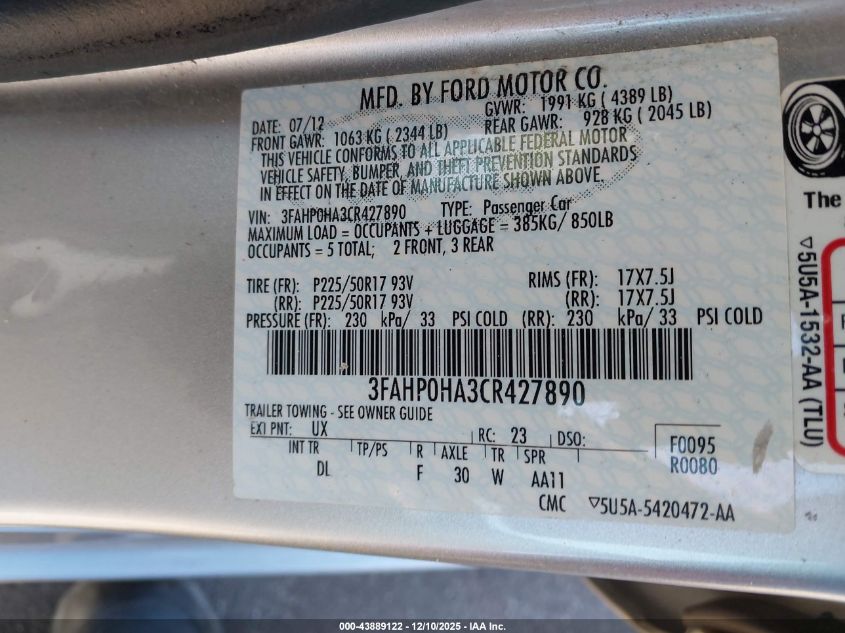 Цвет СеребряныйЦилиндры 4Привод Передний приводVIN 3FAHP0HA3CR427890Состояние СтационарноПовреждения Передняя левая AutoRIA