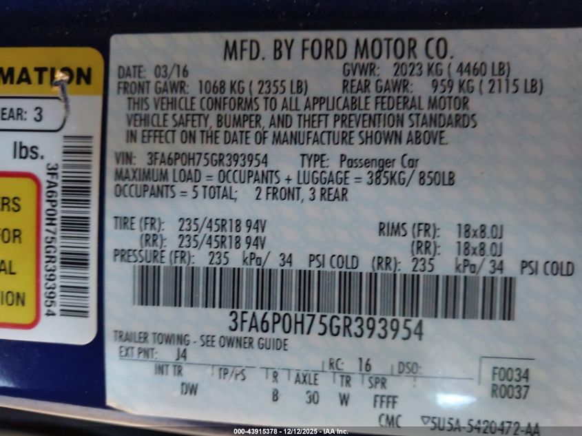 Цвет СинийЦилиндры 4Привод Передний приводVIN 3FA6P0H75GR393954Состояние СтационарноПовреждения Передняя или задняяДата аукциона 2025-12-17 AutoRIA